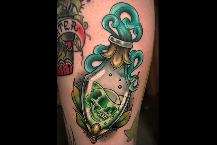 Kristin Parlier is a guest tattoo artist from Cedar Rapids, IA, with a flair for the weird and wonderful. She specializes in neo-traditional tattoos that lean into the creepy—think coffins, eyeballs, fangs, and other dark, playful imagery. Her style mixes bold lines, rich colors, and a fun twist on spooky themes that make every tattoo both eerie and eye-catching.